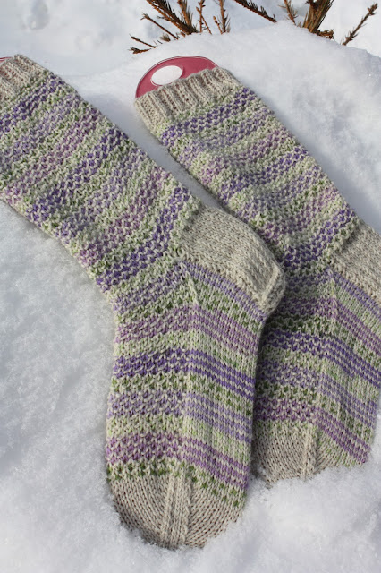Kuten edellisessä postauksessa mainitsin, niin sukkia on tosiaan tullu tässä talven aikana jo muutamat tehtyä.. Liityin tuossa vuoden alussa Facebookissa Novitan sukkaryhmään, jossa ihmiset esittelevät mitä kauniimpia sukkia yks toisensa jälkeen. Niitä kun oon sieltä selaillu, niin eihän siinä mitenkään voi välttyä inspiraatiolta ja innolta käydä puikkojen ja lankojen kimppuun!